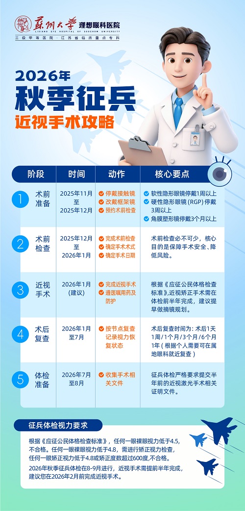 热血军营梦,视力先达标!2026 年男兵应征报名通道已正式开启!对于受近视困扰的有志青年而言,视力达标是叩响军营大门的关键门槛。根据《应征公民体格检查标准》,屈光不正经准分子激光手术后需满半年且无并发症、裸眼视力达 4.8 以上方可合格。把握黄金手术时间节点,提前规划近视矫正,才能为参军梦想扫清障碍。以下这份时间规划指南,助你清晰备战、顺利应征。