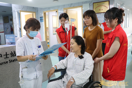 图为吐尔德古丽在女儿地娜尔与爱心志愿者的陪伴下,被推入手术室准备做手术。