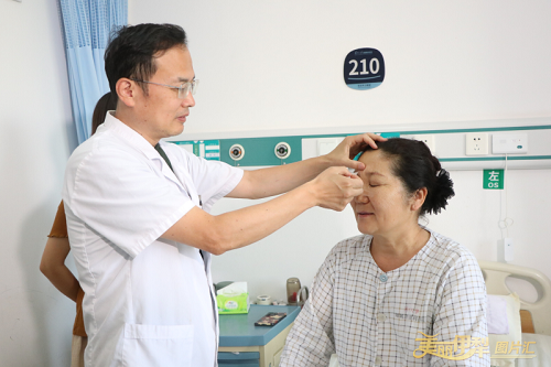 图为赵庆亮轻轻揭开患者吐尔德古丽右眼上的纱布。