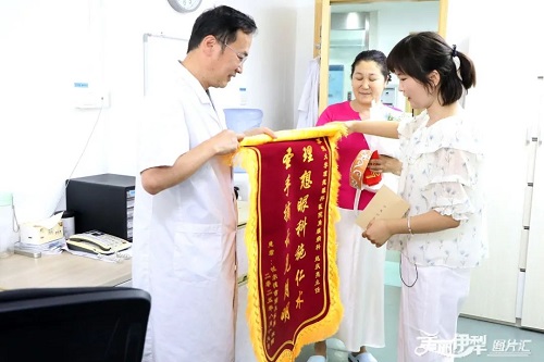 图为吐尔德古丽母女俩给医院和主治医生赵庆亮赠送锦旗。