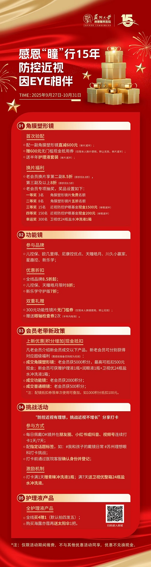 2. 老会员换片第二副 8.5 折、第三副及以上 8 折,还能抽 “免费OK 镜名额”,领取 “近视防控基金现金1500元”!