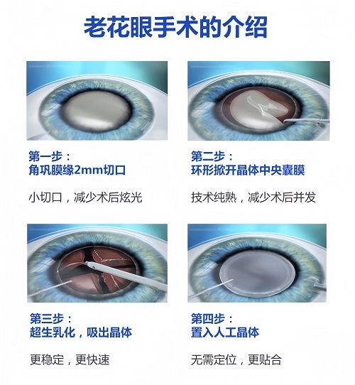 2. 人工晶状体置换术:替换老化晶状体,置换多焦点人工晶体,同步解决老花、近视、白内障,术后可获全程视力。