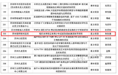 近日,苏州市 “科教强卫” 工程重点项目立项名单正式公布,由苏州大学理想眼科医院眼视光科朱秋健医师牵头申报的课题《现行光学矫正在青少年近视防控的真实世界研究》成功获批面上项目!这一立项不仅是对朱秋健医师专业能力与科研创新力的权威认可,更彰显了我院在青少年近视防控领域的科研实力与责任担当,为区域近视防控工作注入了新的动力。